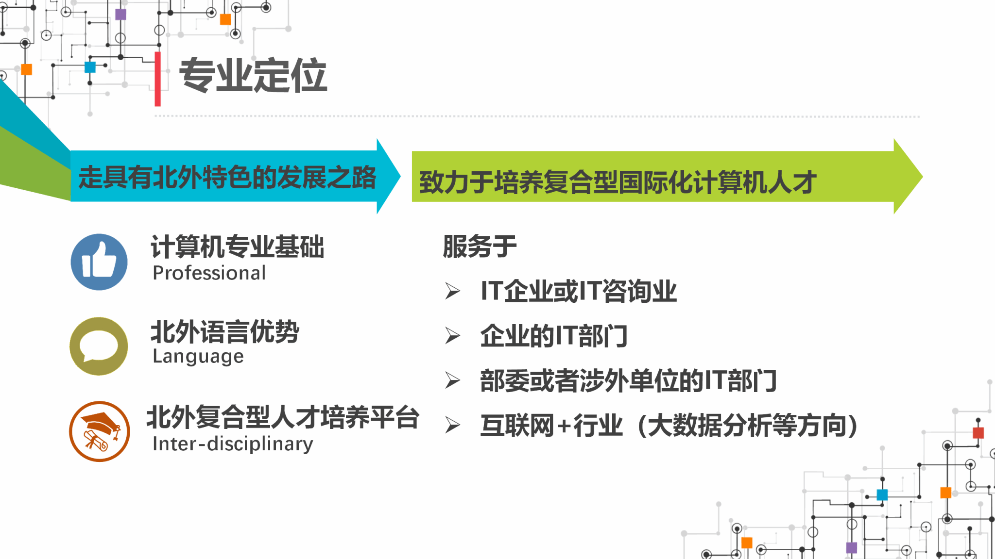 学院的复合型人才培养的特色优势,主要体现在两个方面:一是与外语复合。充分发挥北外的外语学科优势,保障学生拥有较强的外语沟通能力,大部分毕业生能以英语作为工作语言,为毕业生到国内外顶尖高校的计算机相关专业深造奠定坚实基础;二是与其他学科复合。将金融、管理、新闻、语言学等学科的课程纳入培养方案,以大数据分析、信息科学素养为基础,促进学生多学科交叉融合能力的培养,助推“新工科、新文科”建设。